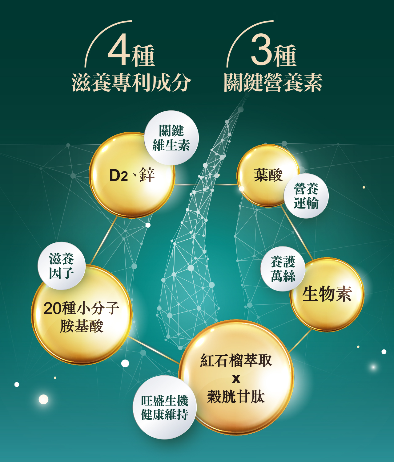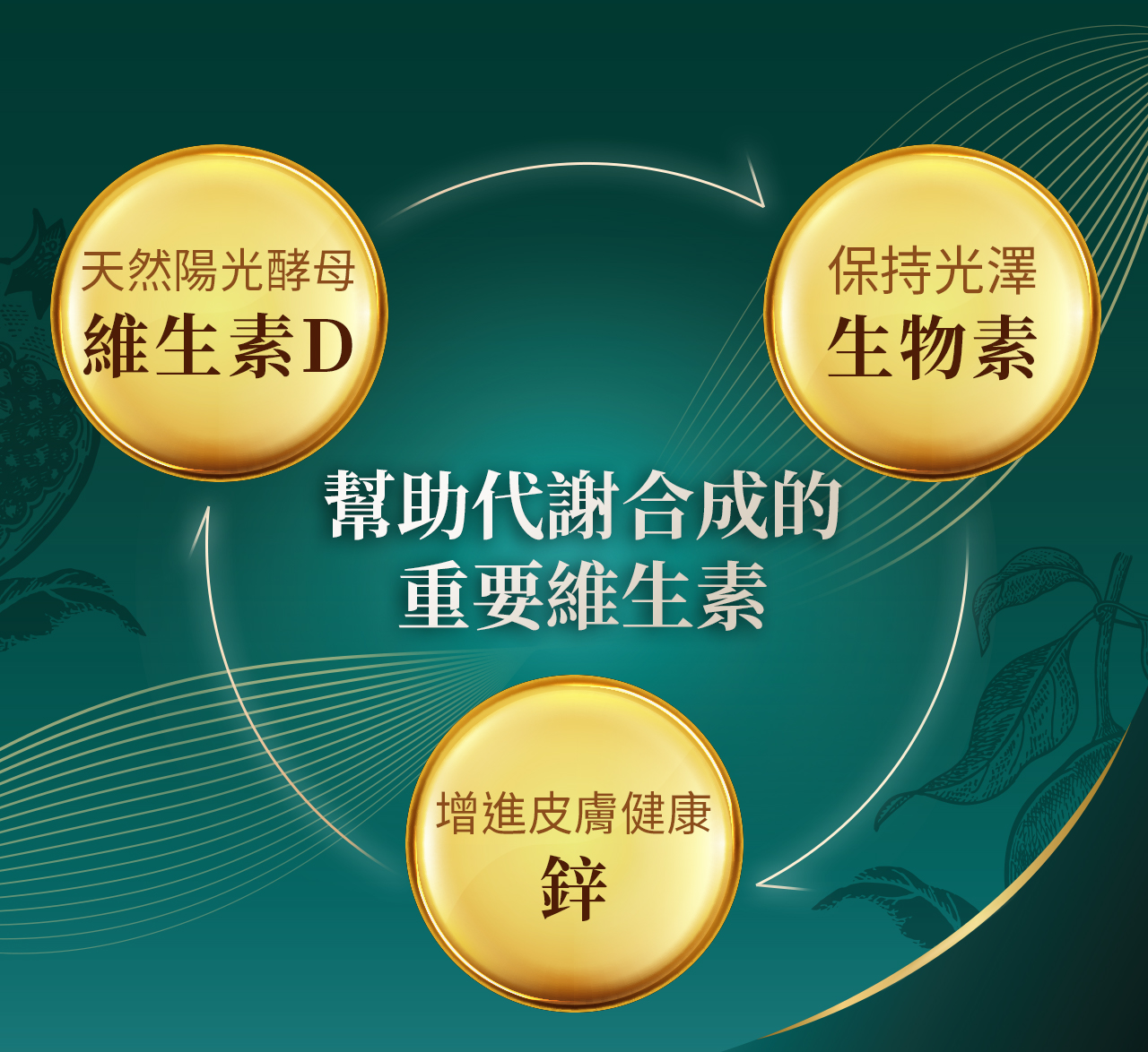 ✦ 生物素、鋅足量補充,有助於皮膚組織和蛋白質的合成,由內滋養根源