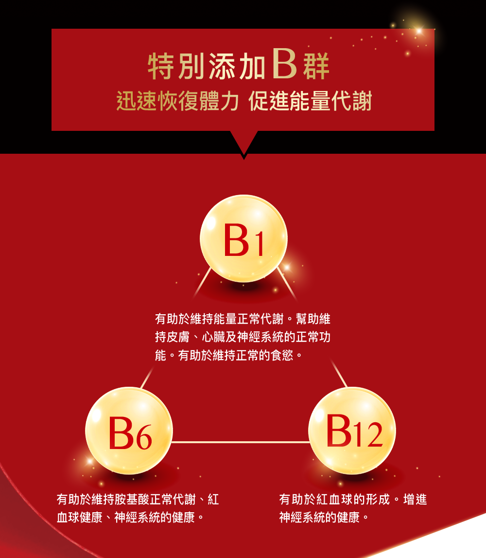 ✦ 維他命B1、B6、B12支持肌肉、蛋白質能量代謝💪