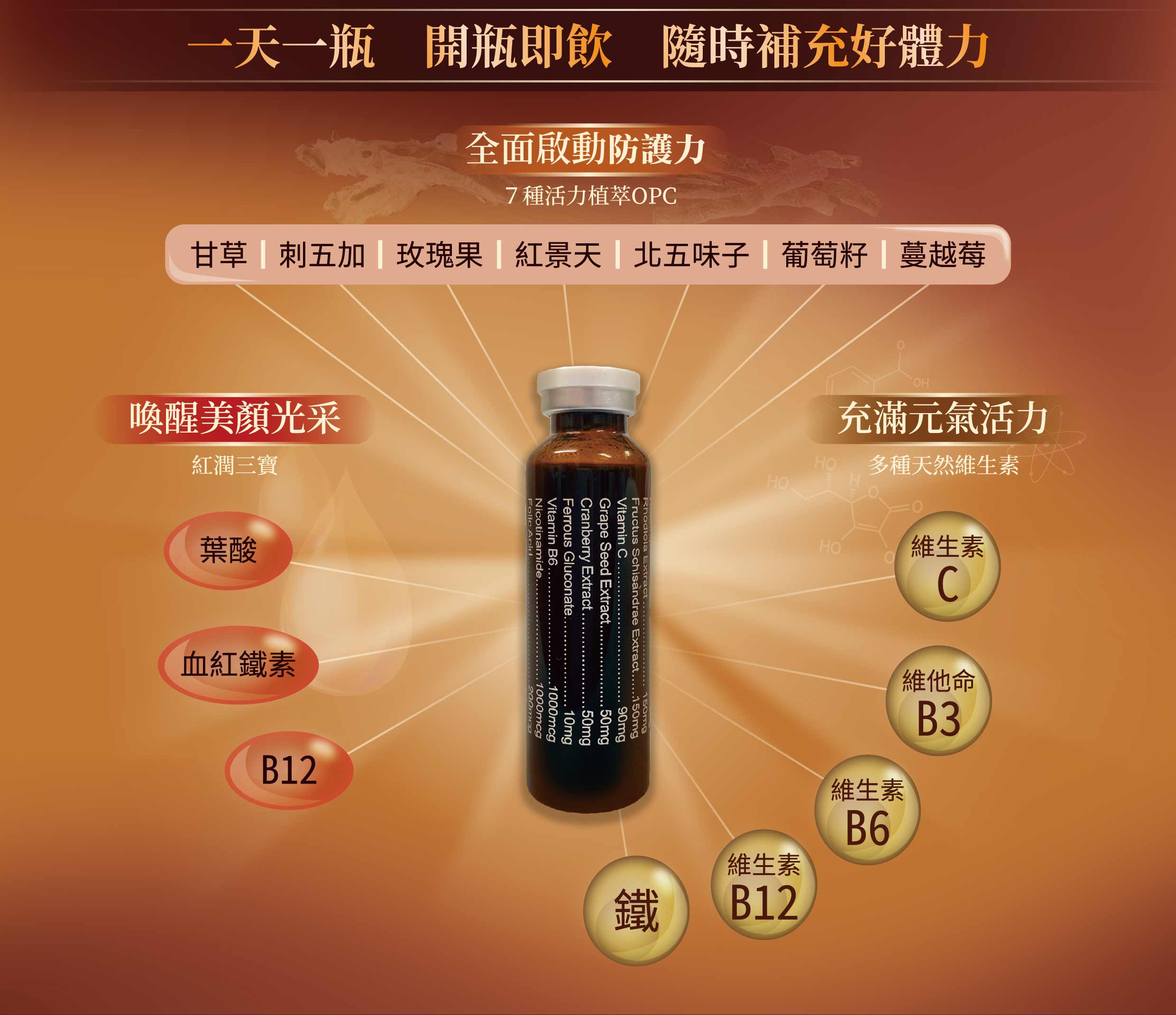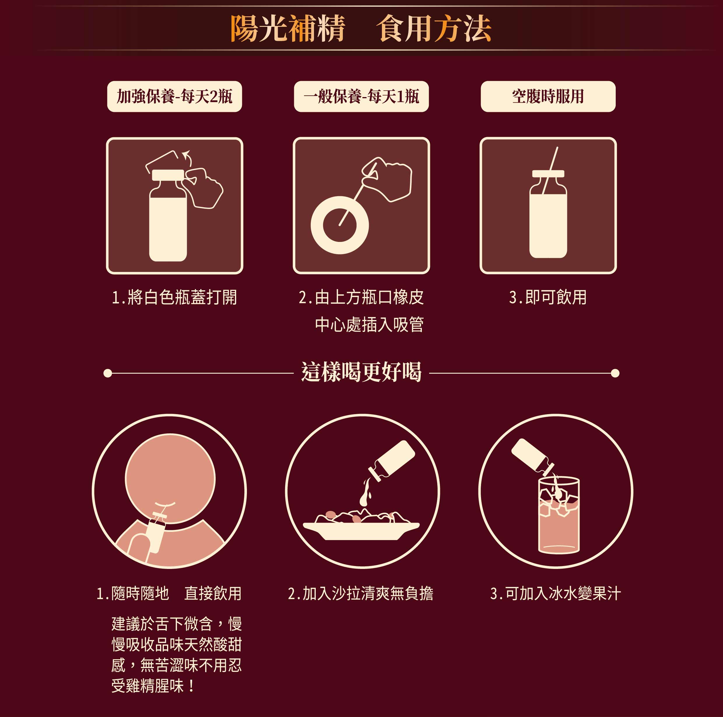 食用方式:一般保養,每天 1 瓶,空腹時飲用