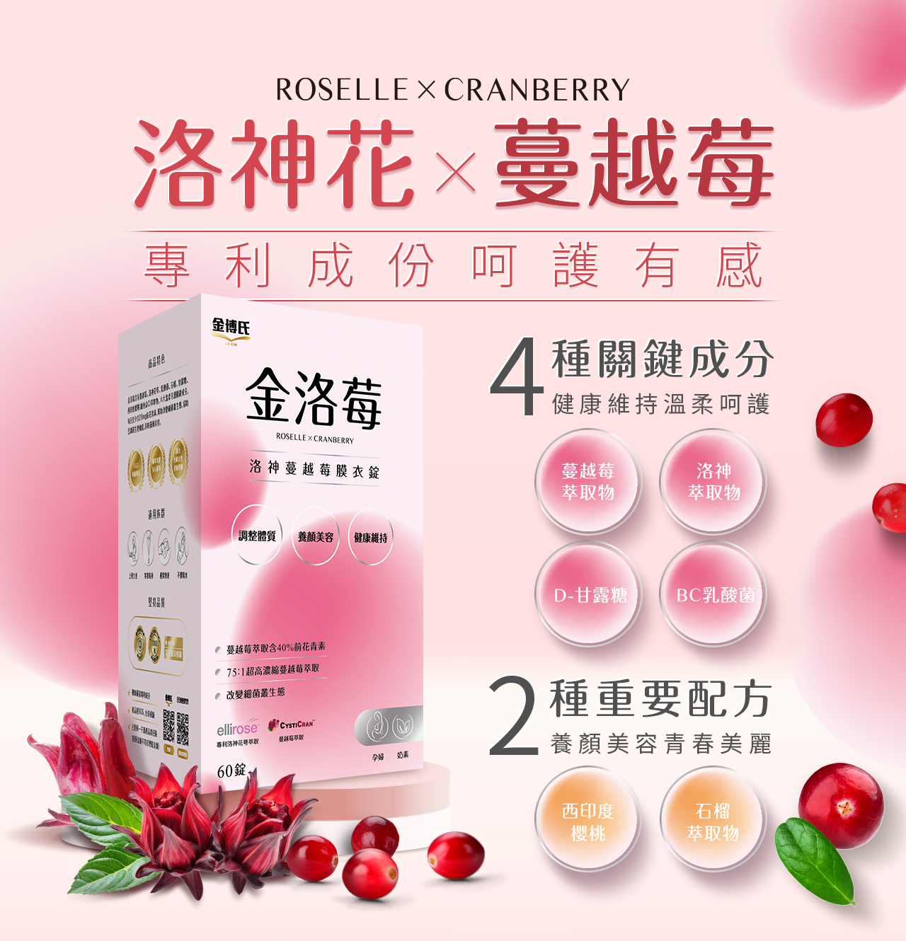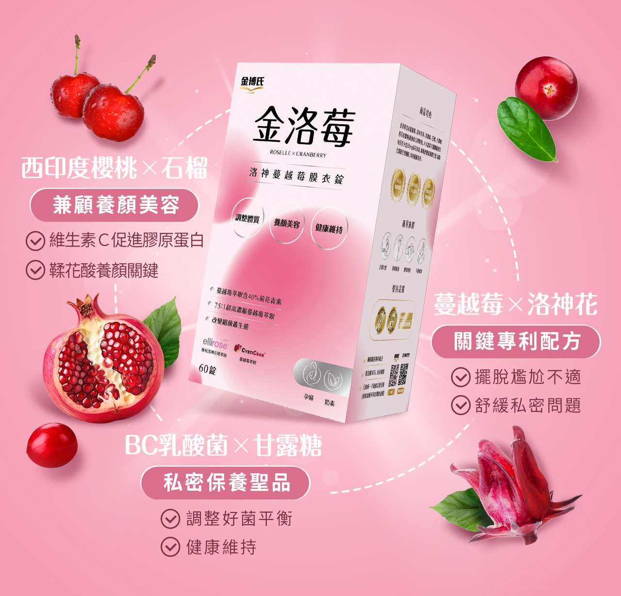 成 分:專利蔓越莓 (CystiCran)、專利洛神花萃取 (ellirose)、D-甘露糖 (D-Mannose)、BC 乳酸菌、西印度櫻桃、石榴萃取