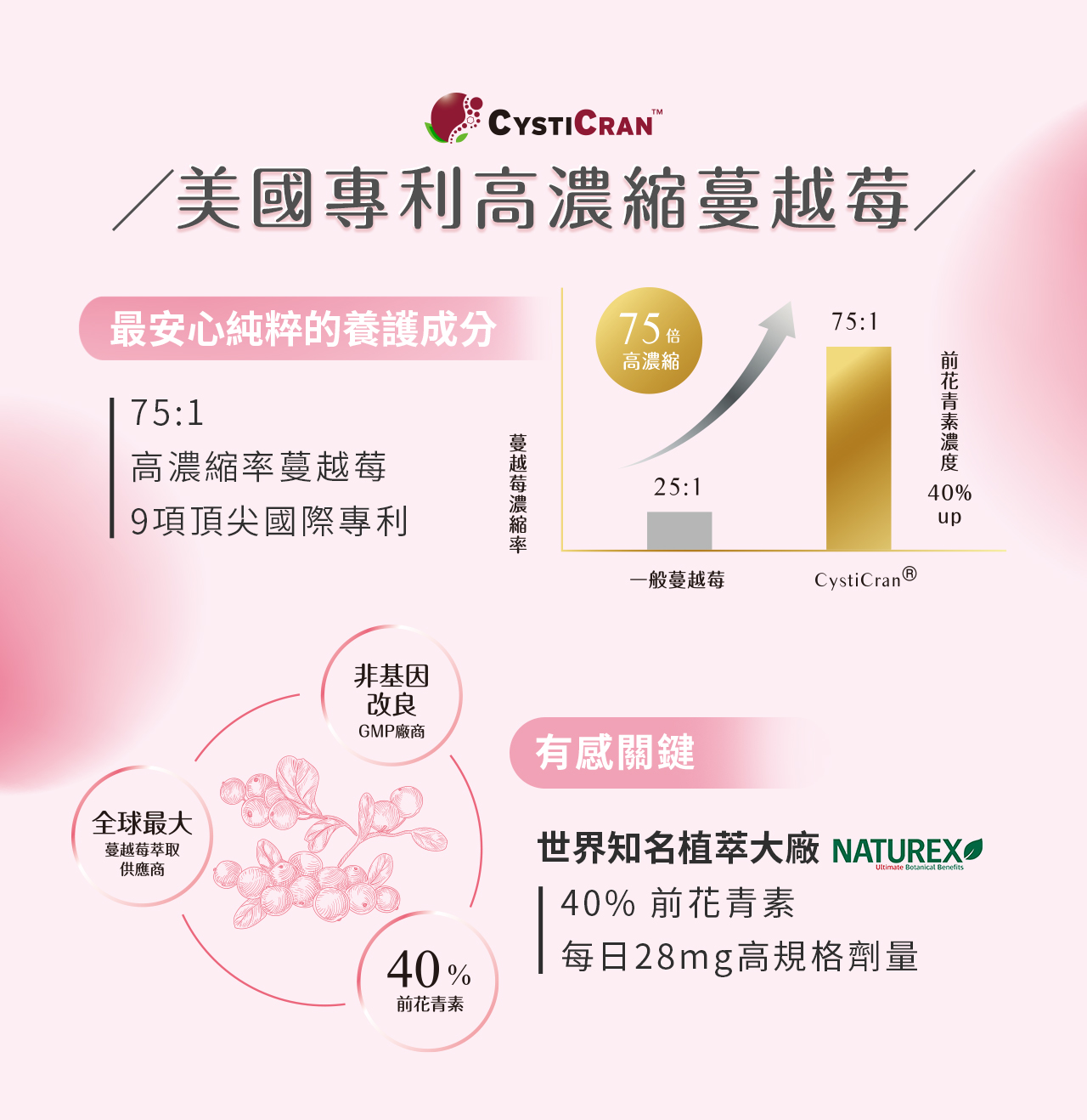 ✦ CystiCran®專利蔓越莓萃取,75:1高濃縮、含40%前花青素,支持泌尿道健康、抑制壞菌附著