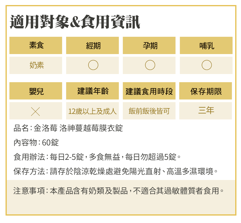 建議年齡:12歲以上及成人,素食者(奶素)、經期、孕期、哺乳期可食用