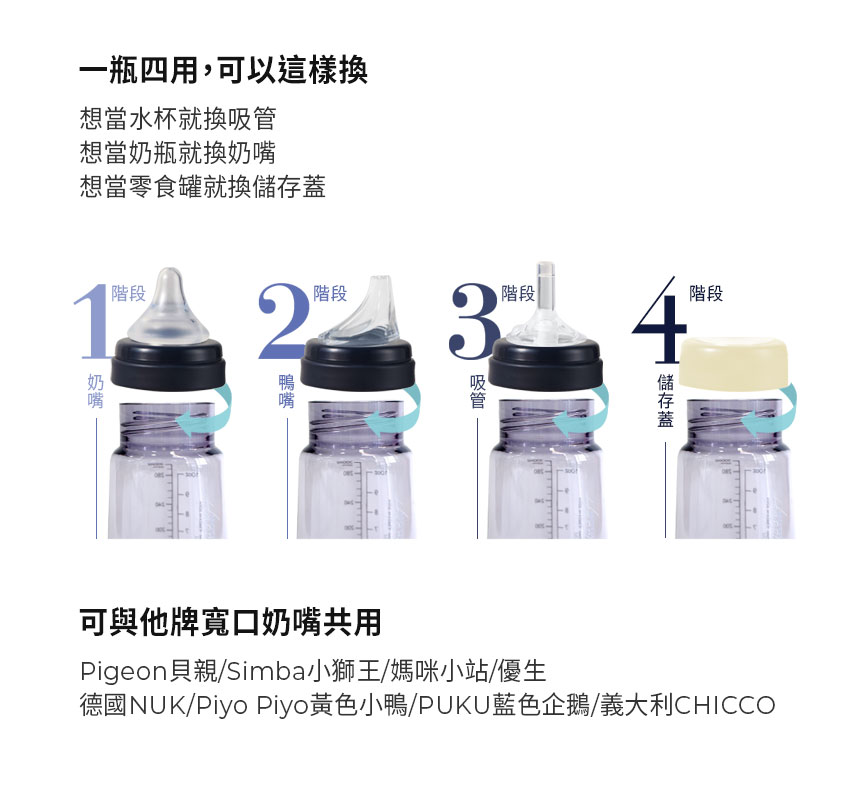 ✦ 高相容性,可與貝親 / 小獅王 / Chicco / NUK寬口奶嘴通用