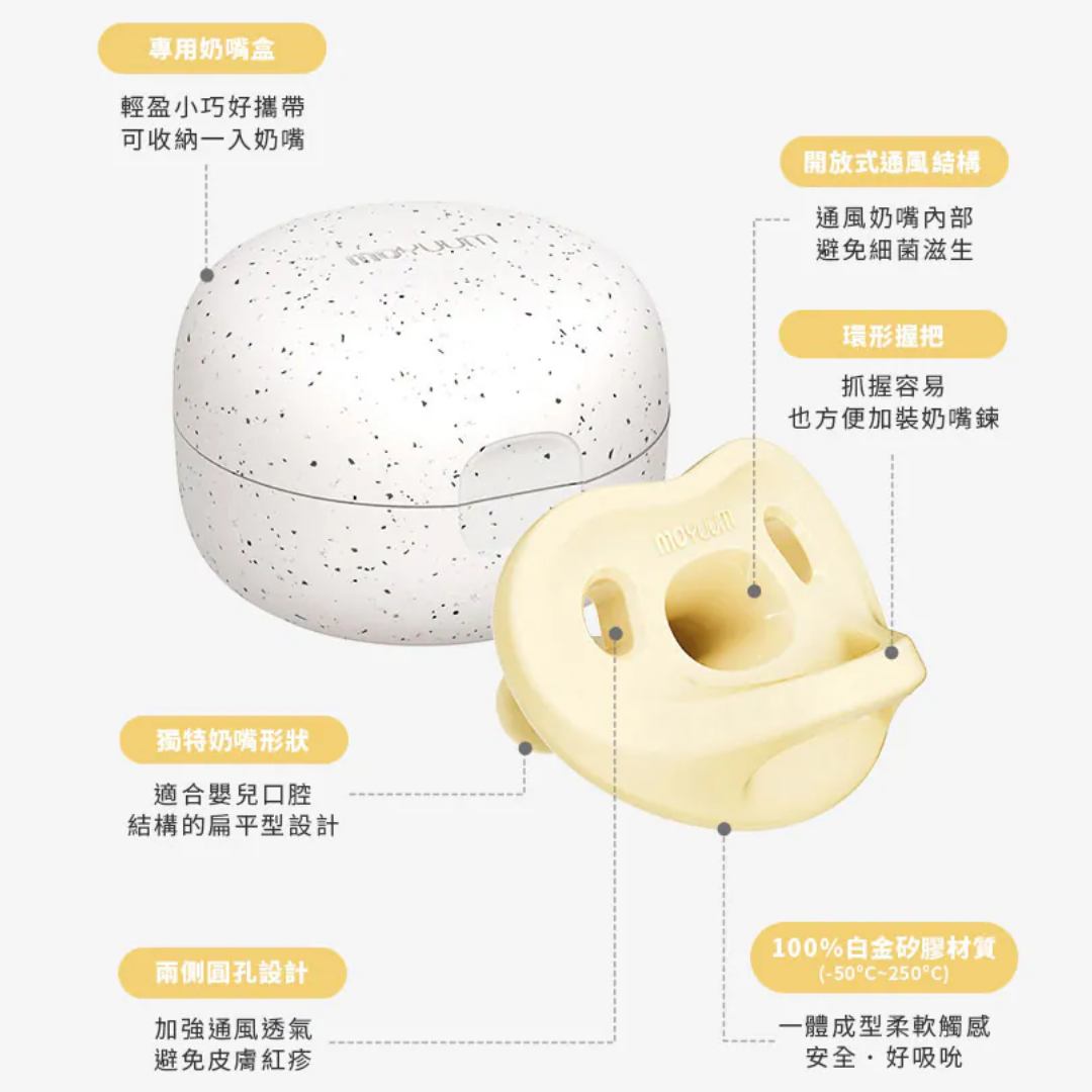 材質:奶嘴(矽膠-50°C~250°C)、奶嘴盒(PP-20°C~110°C)