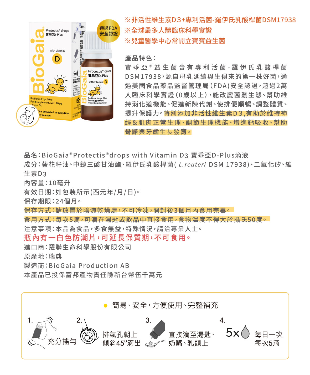 成 分:花籽油、中鏈三酸甘油酯、羅伊氏乳酸桿菌(Limosilactobacillus reuteri DSM17938)、二氧化矽,維生素D3