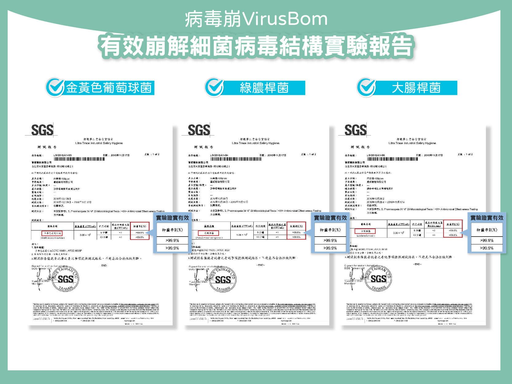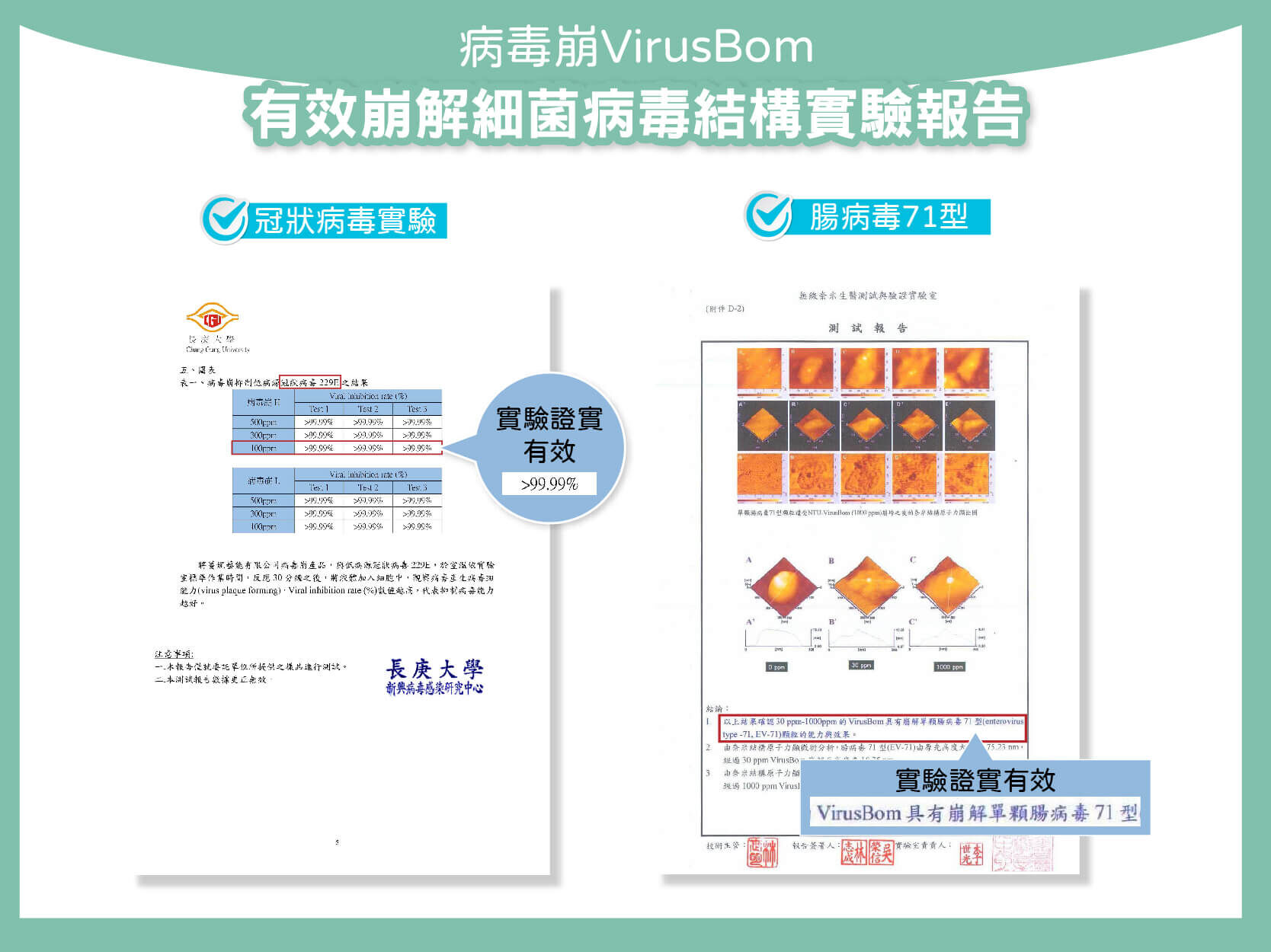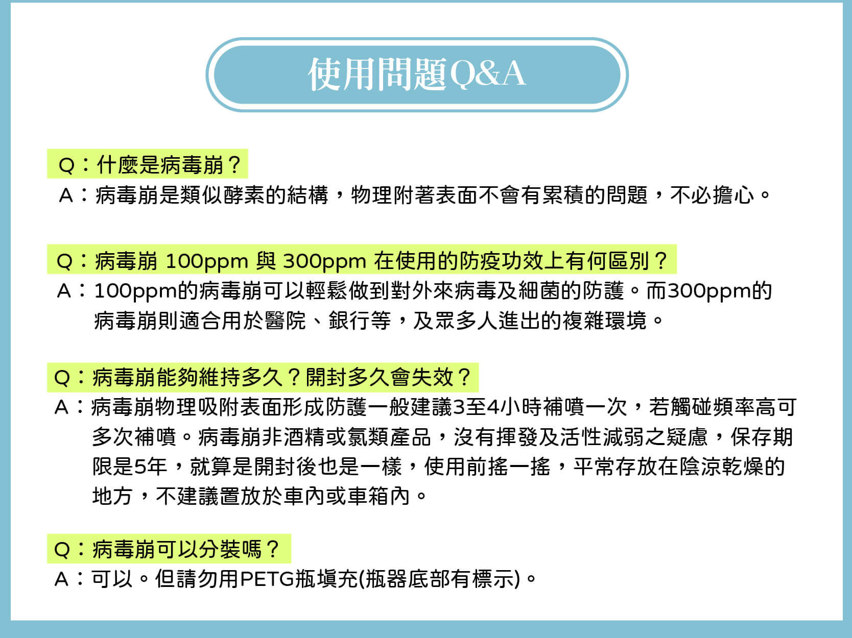 材質/成分:100ppm,具有氧化及還原能力之分子酵素(NTU-VirusBom臺大病毒崩)、Pure Water、Ethanol 0.01%