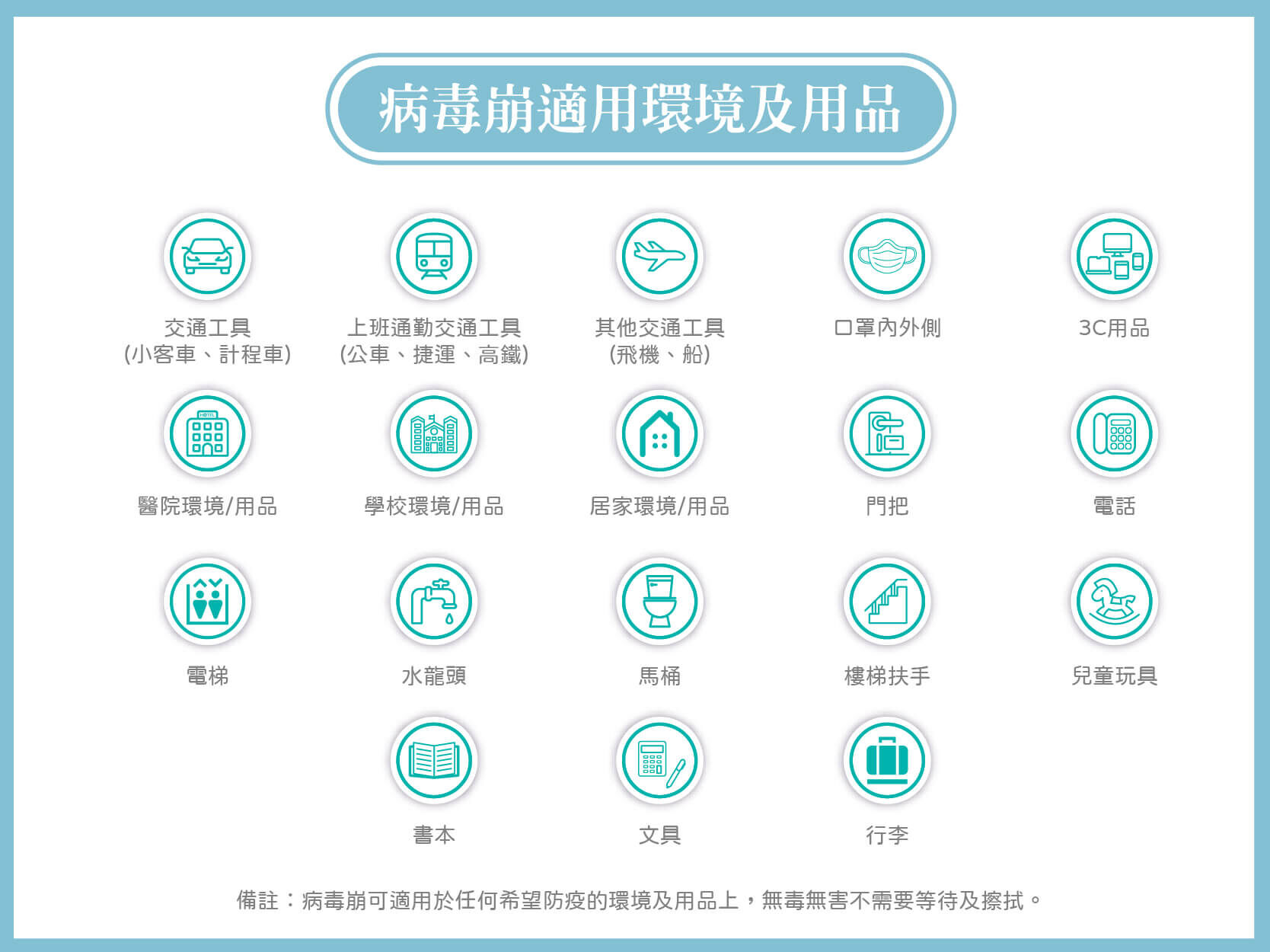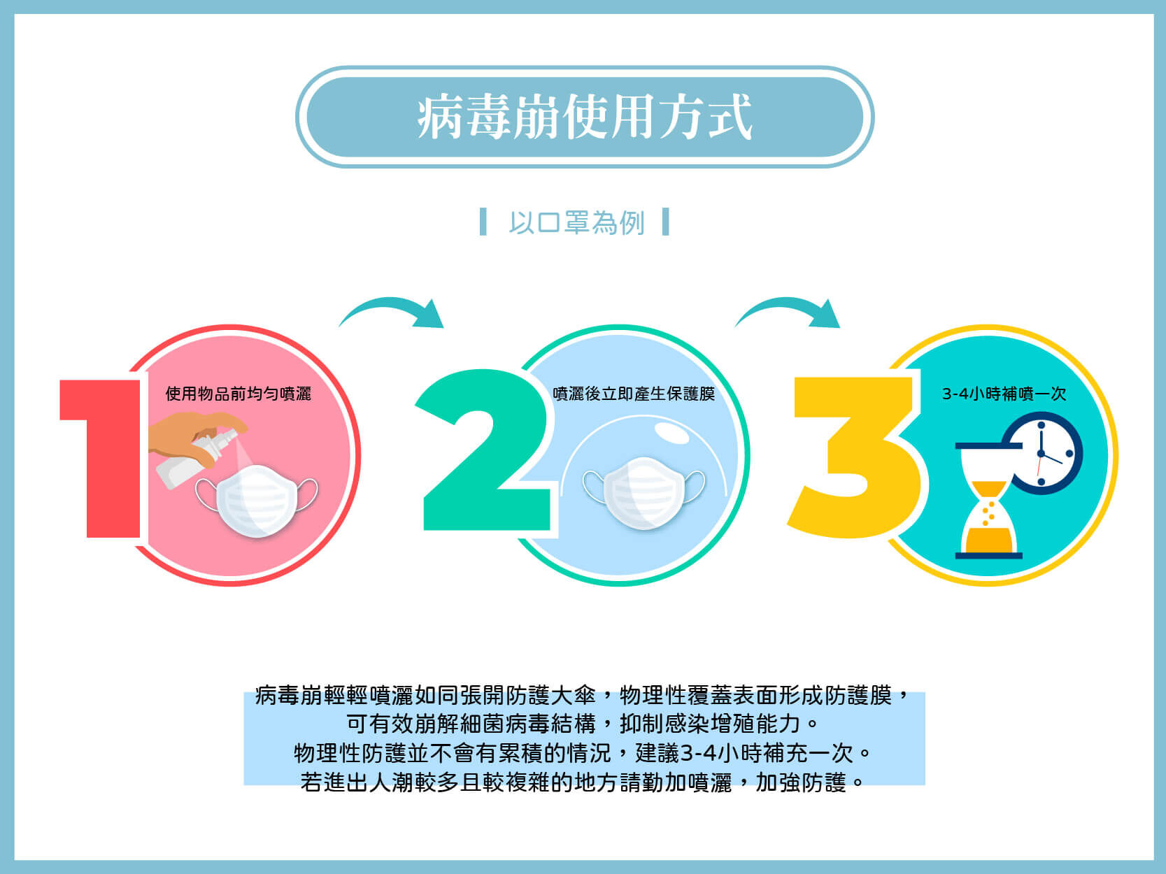 使用方法:直接噴灑在如衣服、口罩、電話、門把及餐桌椅等任何可能接觸到的物品上