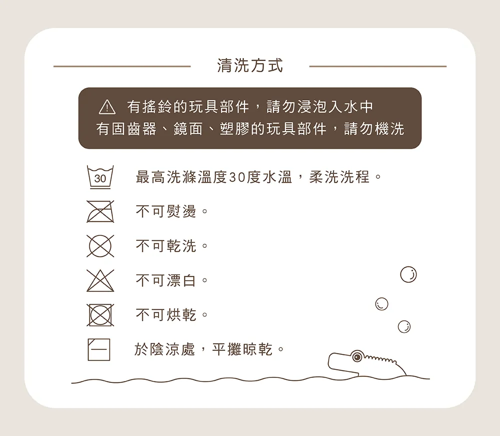 清洗方式:用柔軟的濕布擦拭,有搖鈴、鏡面的部件請勿浸入水中。