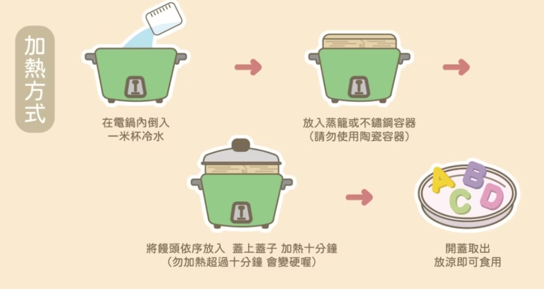 加熱方式 :饅頭冷凍取出後無需退冰,電鍋外鍋放入一杯冷水,將饅頭連同饅頭紙放入不鏽鋼容器中一起放入電鍋,蓋鍋蓋時可以夾一根筷子避免鍋內蒸氣過多,加熱5分鐘,電鍋跳起後悶3分鐘即可開蓋取出。
