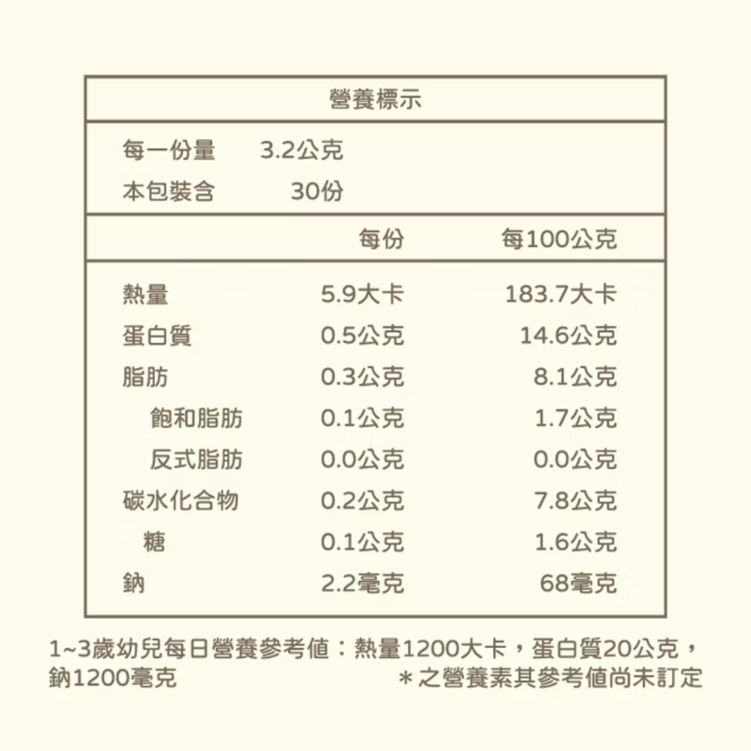注意事項 : 本產品含有大豆類,芝麻,麩質之穀物及其製品,不適合對其過敏體質者使用。