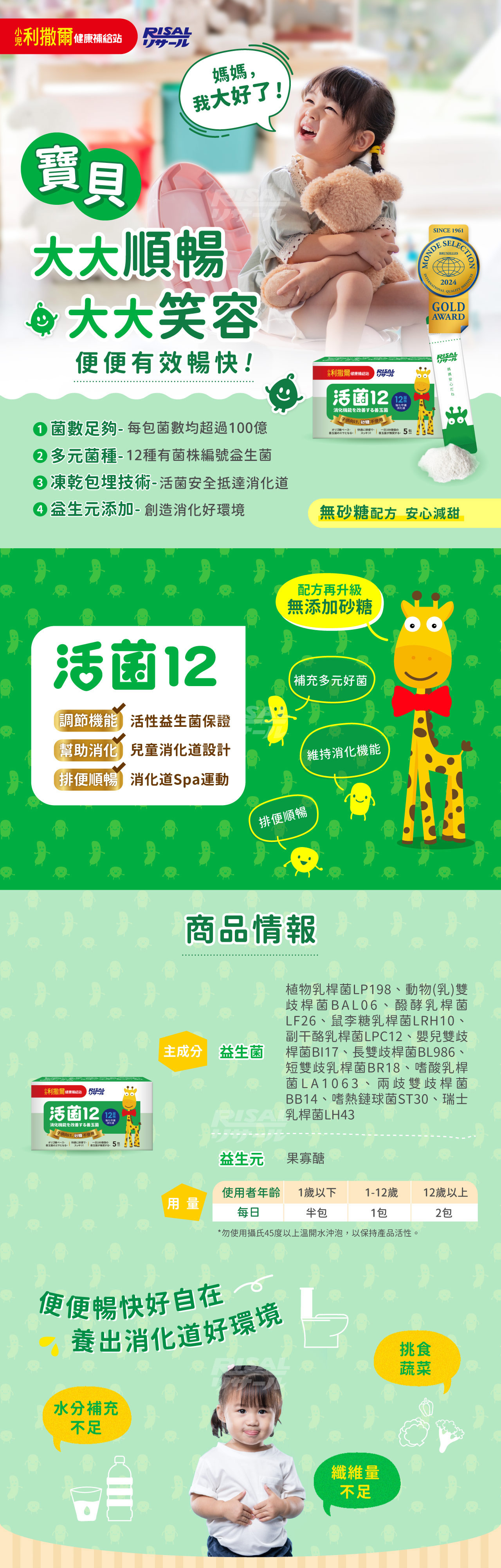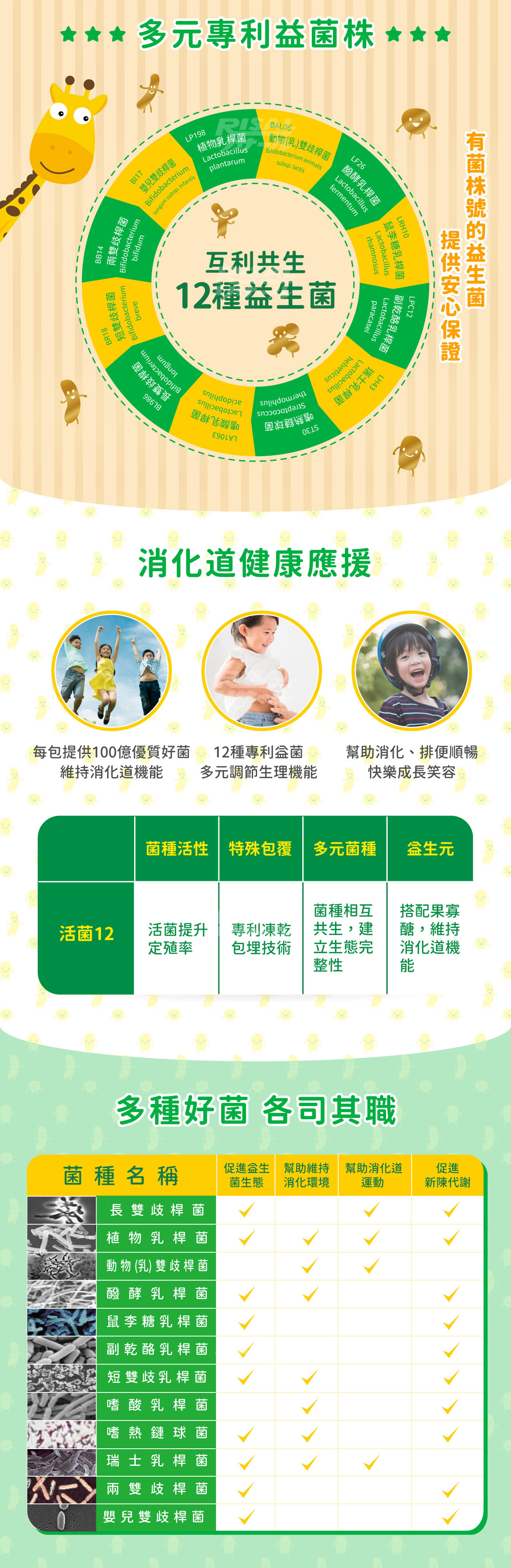 12種專利益菌配方,多元完整的益生菌,改變消化道菌叢,幫助排便順暢