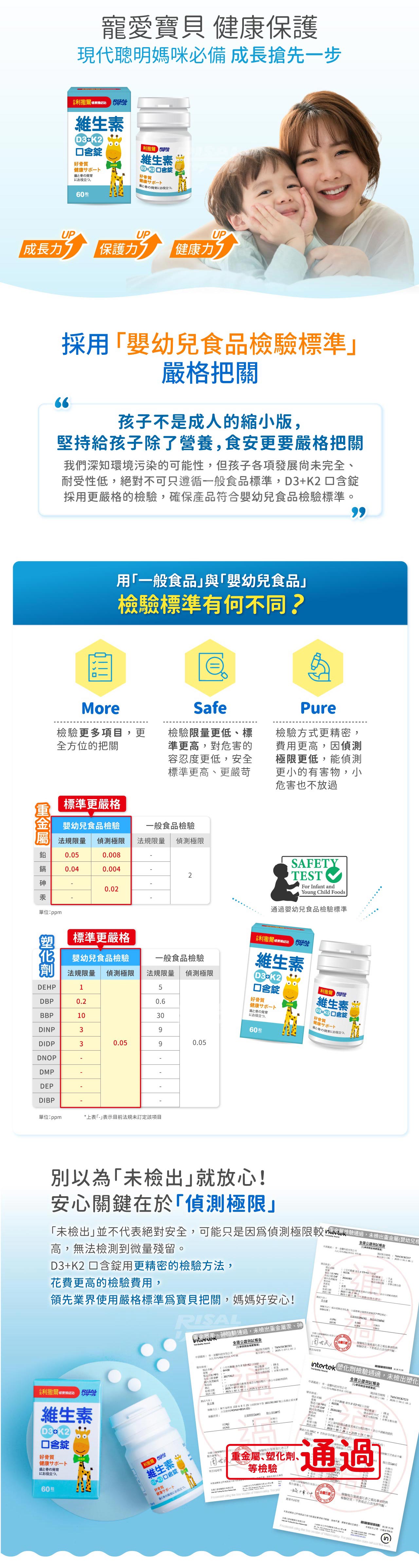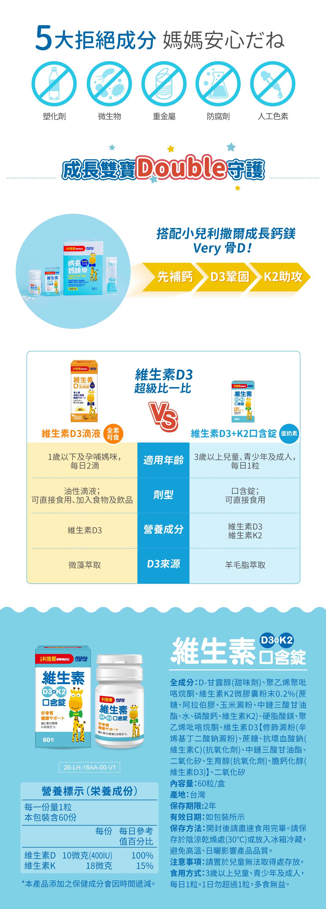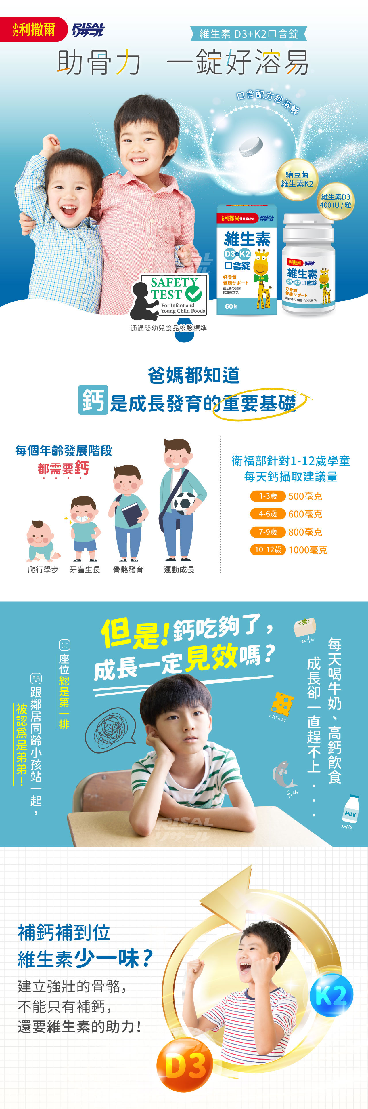 口含錠結合了維生素D3和K2,兩者的組合有助於鈣的吸收和利用,進一步促進骨骼的發育和強健