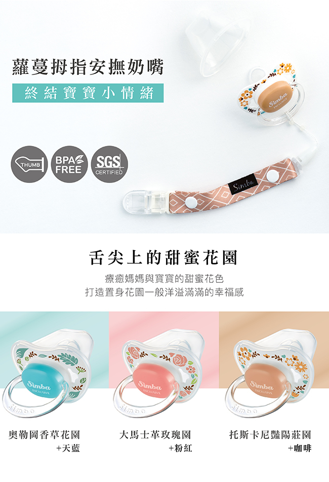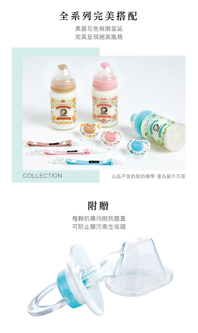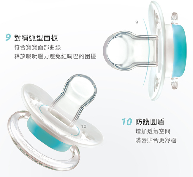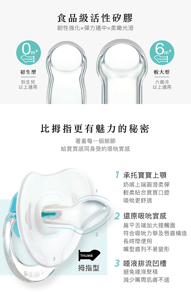 1.嚴選食品級活性矽膠,通過SGS嚴格檢驗,不含雙酚A。2.拇指型特殊造型設計,符合嬰兒唇齒構造,長時間吸吮使寶寶嘴型不變形,讓牙齦與齒列正常發展。3.附奶嘴防塵蓋,可防止髒污,衛生收藏。