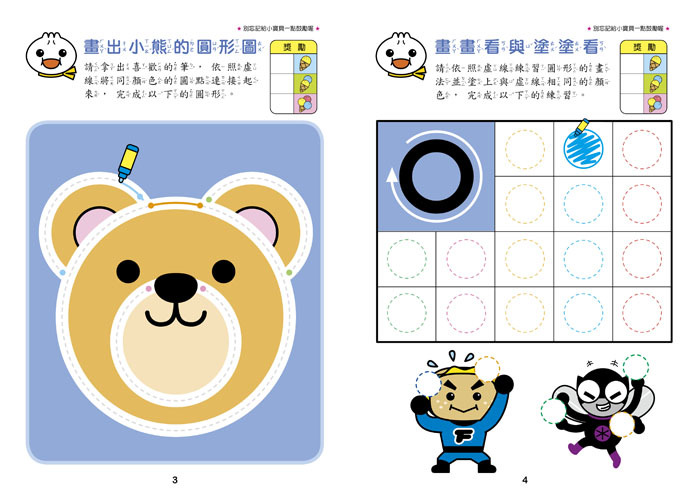 有圓形、正方形、三角形等各館圖形,還有好玩的練習遊戲,讓孩子快樂的學習畫圖形。