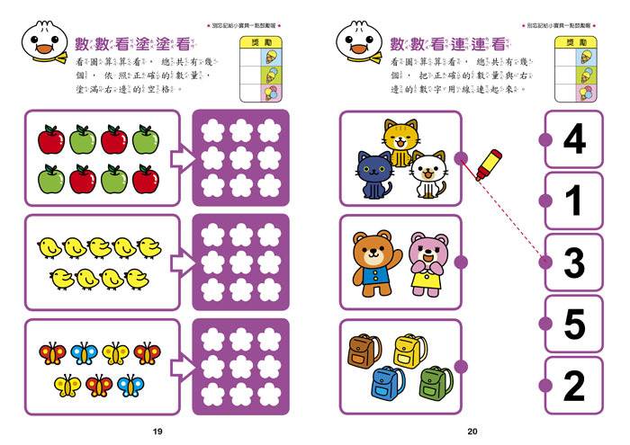 有數字1-10的筆畫練習,以及數字數一數的各種遊戲,讓孩子快樂的學習數字與數數。